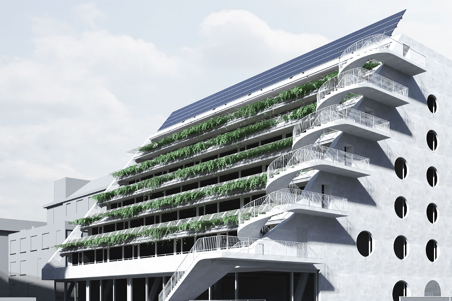 Das Tragwerk bleibt grösstenteils sichtbar, weshalb erhöhte Anforderungen an die Sichtbetonqualität gestellt werden. Neben der inneren Tragstruktur werden im Aussenbereich zwei Fassadenwände, die Aussentreppen und die Pflanztröge in Ortbeton erstellt, welche als sichtbar verbleibende Betonflächen vorgesehen sind.