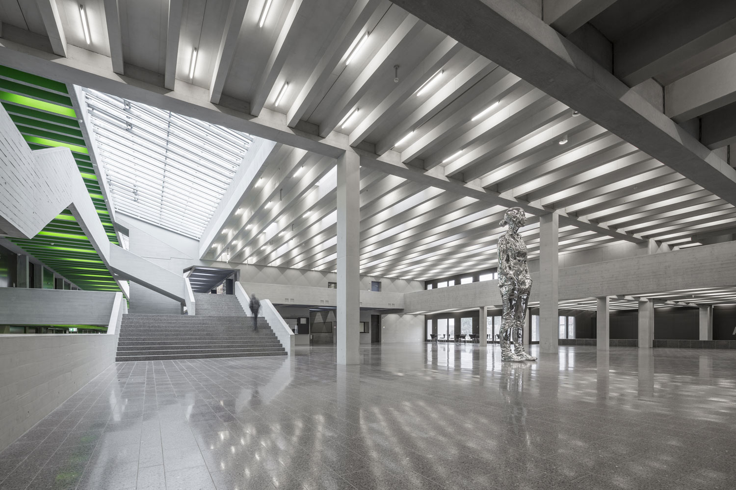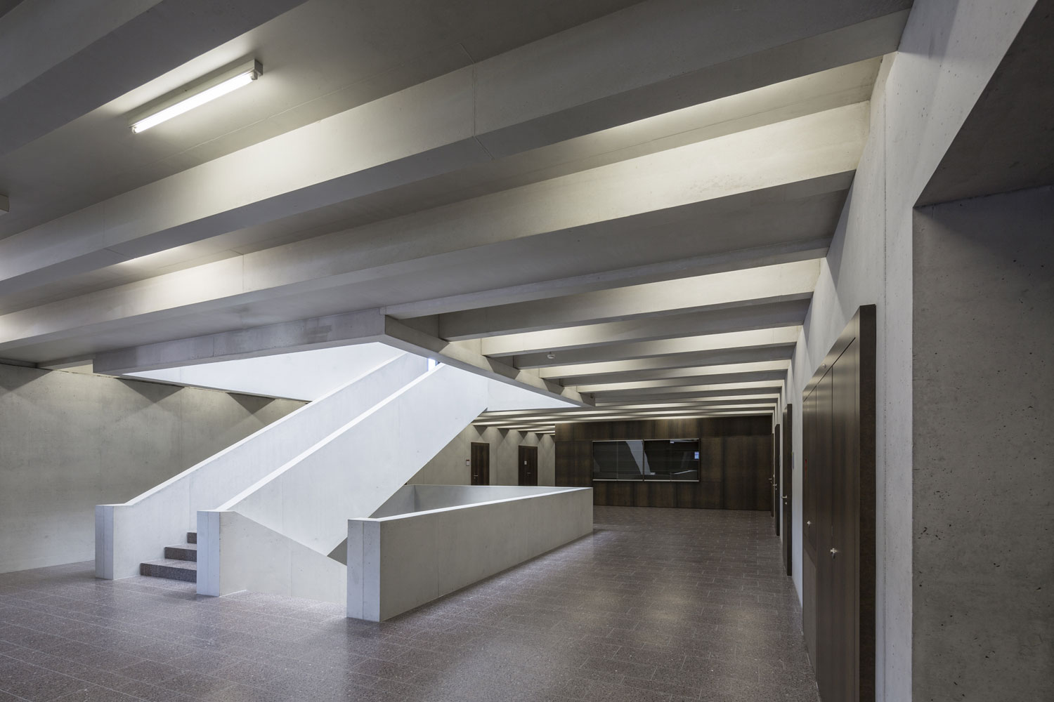 Der Neu- und Umbau der Kantonsschule Heerbrugg umfasst einen neuen Mitteltrakt und die Sanierung der bestehenden Turnhalle und des Westtraktes. Der Neubau, mit einem Unter- und drei Obergeschossen schliesst direkt an die bestehenden Baukörper an.