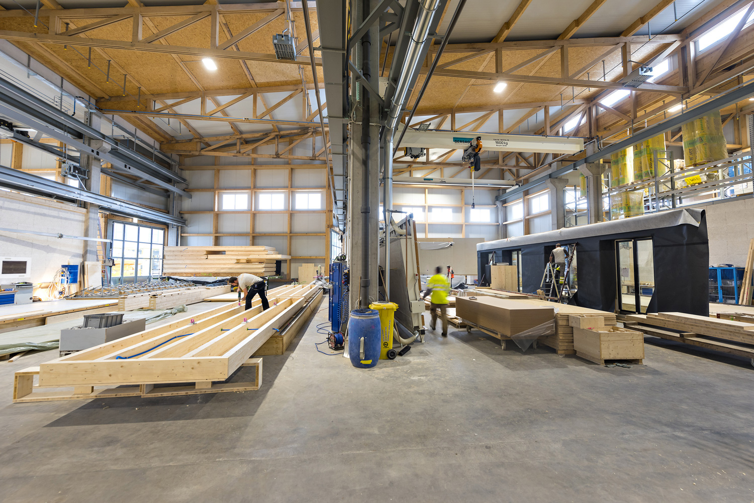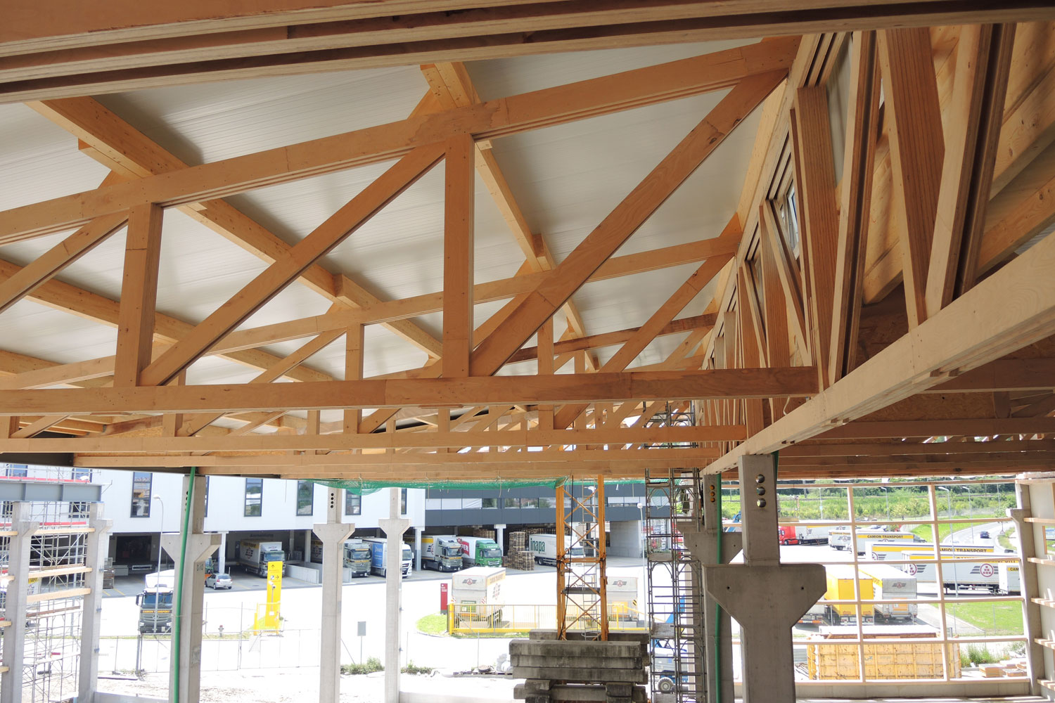 In die flach gegründete Bodenplatte eingespannt sind 31 Ortbetonstützen welche die horizontale Stabilisierung übernehmen und auf denen die Längsfachwerke der Sheddächer sowie die 14m gespannten Kastenelemente des Bürobodens aufliegen. Das Bürogeschoss hat eine Grundrissfläche von 38 x 14m und ist als Holzrahmenbau mit Satteldach ausgebildet.