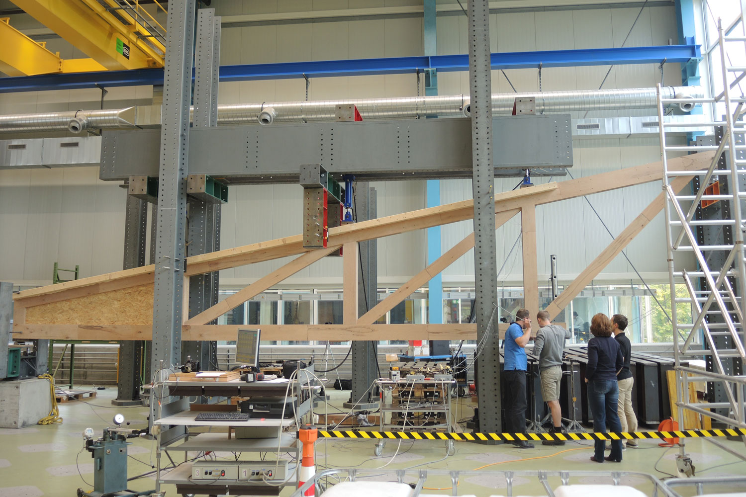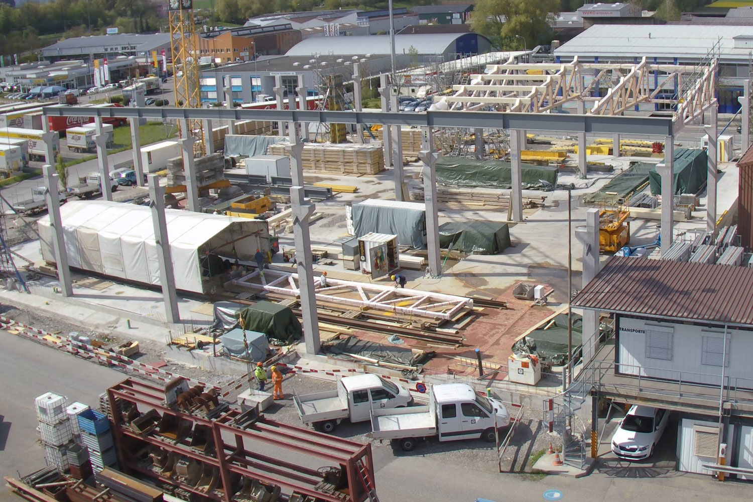 Alle 10 – 15m spannenden Hallenfachwerke sind in Baubuche ausgeführt und konnten dank einer mehrteiligen Ausführung und Knotenverbindungen mit selbstbohrenden Vollgewindeschrauben auf der Baustelle unter einem fahrbaren Zelt hergestellt werden.