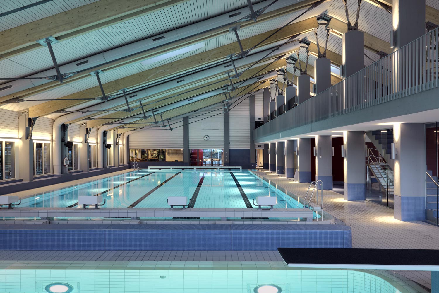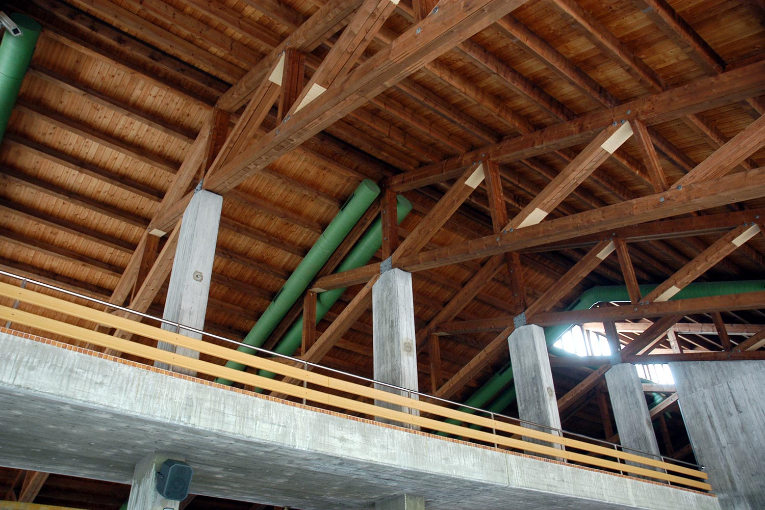 Die bestehende Holz-Dachkonstruktion über dem Hauptschwimmbecken wies gravierende Korrosionsschäden im Bereich der Stahlverbindungen auf und erfüllte die Anforderungen an die Tragsicherheit nicht mehr. Die bestehenden Fachwerkträger wurden durch unterspannte Brettschichtträger ersetzt, die im Raster der bestehenden Fachwerkträger angeordnet und auf den bestehenden Stützen aufgelagert. Die Konstruktion der Träger wurde so gewählt, dass sie von Innen her eingebaut werden konnten, ohne das Dach abzudecken, da sich die Dacheindeckung noch in einem guten Zustand befand.